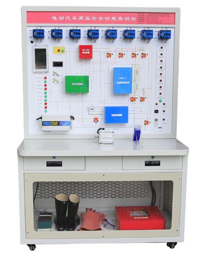 5.實(shí)訓(xùn)臺上部為系統(tǒng)電路原理圖和各系統(tǒng)的實(shí)物,實(shí)訓(xùn)桌下部安裝有低壓電源和高壓電池組,可通過透明窗口觀察鋰電池組。左側(cè)、右側(cè)后側(cè)網(wǎng)孔板通風(fēng)散熱。