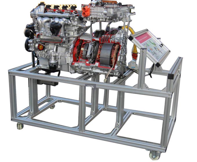 解剖后的混合動(dòng)力系統(tǒng)各總成(包含發(fā)動(dòng)機(jī)、MG1、/MG2電機(jī)、變速器總成和變頻器),大功率減速電機(jī)、控制機(jī)構(gòu)、設(shè)備展示臺(tái)架、控制面板、萬向腳輪等組成。