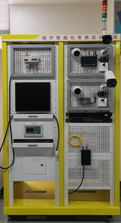 樓宇智能化視頻監(jiān)控系統(tǒng)實訓(xùn)考核裝置由建筑模型平臺、系統(tǒng)器件、輔材及工具四部分組成。建筑模型平臺主要包括平臺框架、網(wǎng)孔安裝板、模擬梁柱體、電源輸入保護及報警單元、標(biāo)準(zhǔn) 19 英寸開放式機架及機箱等;系統(tǒng)器件主要包括各種電源、網(wǎng)絡(luò)、監(jiān)控、顯示、輸入及輸出裝置等;輔材主要包括各種線材、連接及緊固件等;工具主要包括人字梯、各種常用及專用工具等。軟件則由各種專用系統(tǒng)軟件與通用監(jiān)控軟件等組成。使用本裝置能夠使學(xué)生在建筑模型平臺中對智能化工程系統(tǒng)進行安裝、布線、接線、編程、組態(tài)、集成、調(diào)試、運行、管理及維護等操作,從而了解各系統(tǒng)在實際中的應(yīng)用并熟練掌握其根本技術(shù)要點;能夠訓(xùn)練與檢驗學(xué)生的團隊協(xié)作、交流溝通、計劃組織、工程實施等能力,豐富職業(yè)素養(yǎng),提高綜合職業(yè)技能,是適合項目考核、老師教學(xué)及學(xué)生實訓(xùn)等多方面要求的樓宇智能化工程技術(shù)技能實訓(xùn)考核平臺。